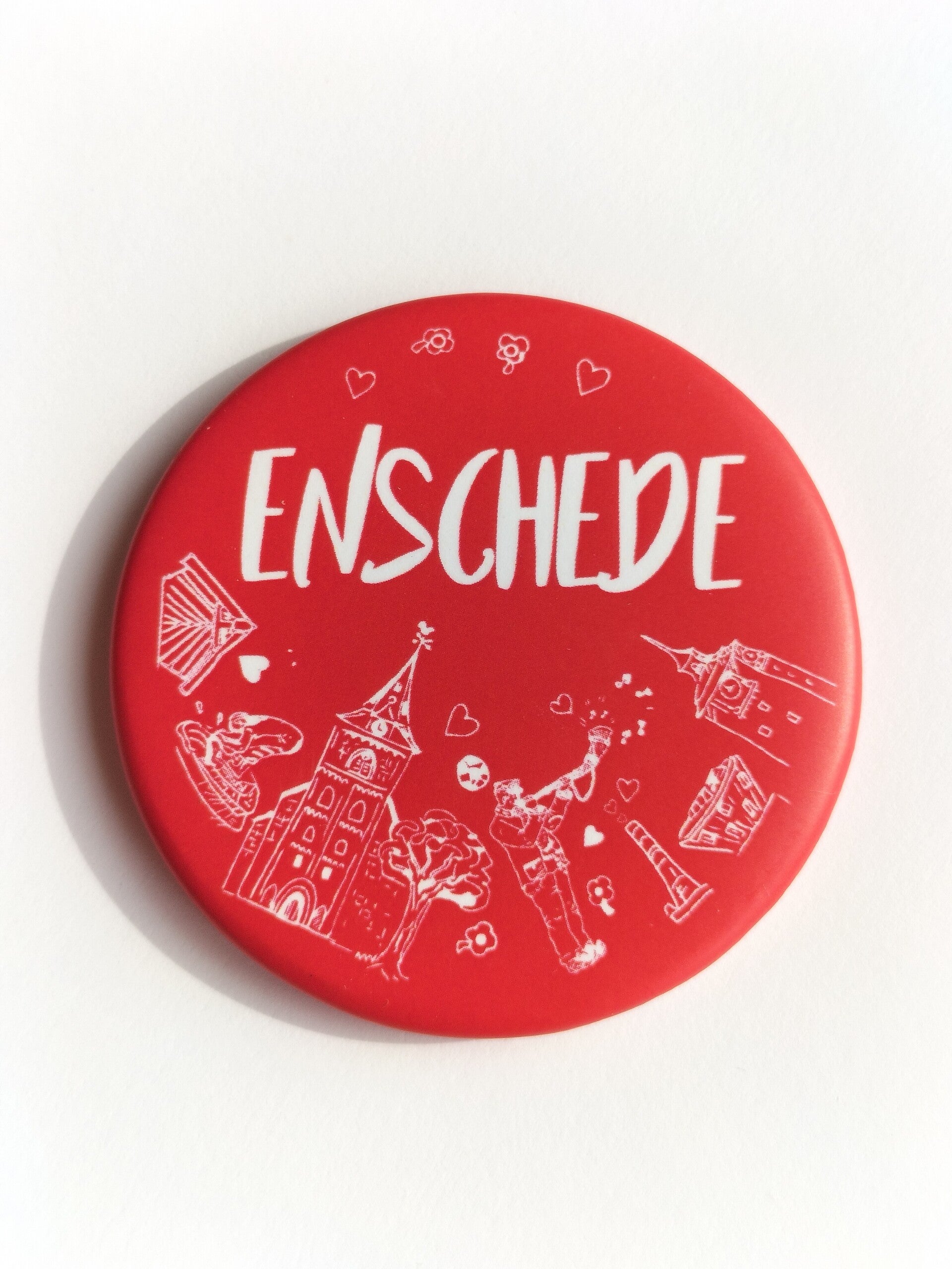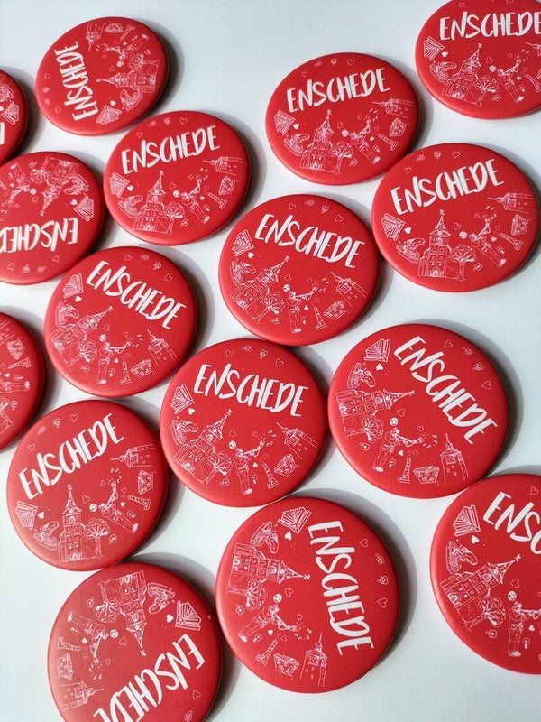 On the other side, they have a magnet that allows it to be placed on the refrigerator. With an amazing Patty Peppe illustration about Enschede City Highlights!
