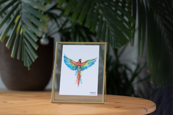 2 x A5 Prints in a glass frame of 26 x 20 cm. Front side with Arara print and the back with Essência print